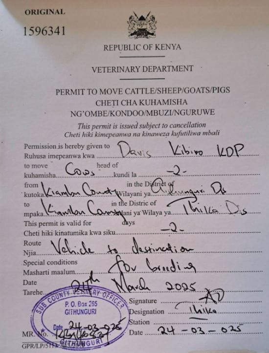In the Githunguri area of Kiambu County, dairy-cow listings show a wide price range depending on breed, pedigree, milk yield, age and lactation status. Heifers or dry cows often sell from around 80,000Ksh–150,000